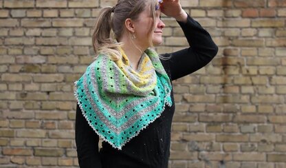The shawl is worked as a traditional triangular shawl, top down, starting with a garter tab cast on. Increases are made on every second row, shaping the triangle and increasing your stitch count. When choosing colors, make sure that your C1 is relatively neutral, as the stitch pattern comes out best in a light colored yarn.