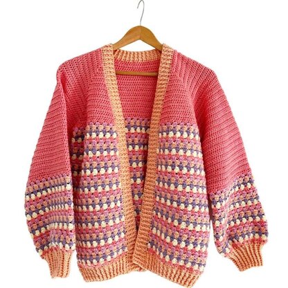 The ‘Stash Buster Granny’ Cardigan is a top-down raglan style design, worked seamlessly from the neck down. [First published in 2022] - It combines single and double crochet stitches through the yoke for structure and ease, flowing into the classic granny stitch pattern across the body and sleeve ends for that timeless, cozy charm.
