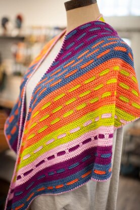 This assymmetric triangular shawl is designed for James River Yarn Crawl 2023 that includes five beautiful yarn shops. Each shop is represented by one of the Pantone colors of the year. I chose to work the colors in order I had visited the shops during last year's yarn crawl, and you can do the same or make up your own order. Once you understand the flow of the design, you can make this shawl larger, or play around with building blocks to your liking. It would be easy to work this pattern in only two colors or all the colors you like from your stash. The shawl has a twin knit version, Yarn Dash.
