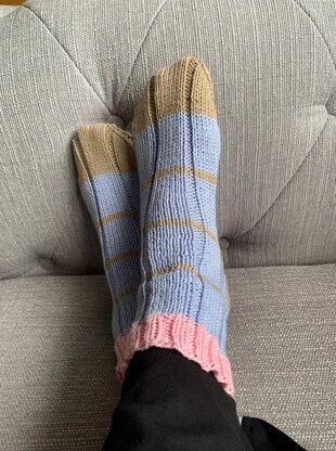 I have a lot of sport weight yarn in my stash so I have been making socks. They are cosy but not too thick that you can't wear them with shoes. All you need is 65g of one colour, 30g of another and 15g of another so it is the perfect way to use up your leftover yarn and they knit up quickly.