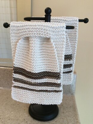 A smaller version of the original Stay Put Kitchen Towel, the Stay Put Fingertip Towel is perfect for hanging in your bathroom or a smaller towel location. It is knitted in soft, absorbent cotton worsted weight yarn in garter stitch. There is a keyhole midway through the towel that allows one end to be pulled through so the towel will STAY on the bar or handle WITHOUT a button.