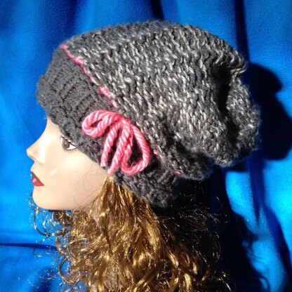 This loom knit winter hat is perfect for playing in the snow. The hat is knitted on the purple Knifty Knitter 48 peg round loom. Two strands of worsted weight yarn (approx 160 yards of each yarn) are used to achieve the warmth and texture, while a short piece of super bulky yarn is used to embellish the hat.