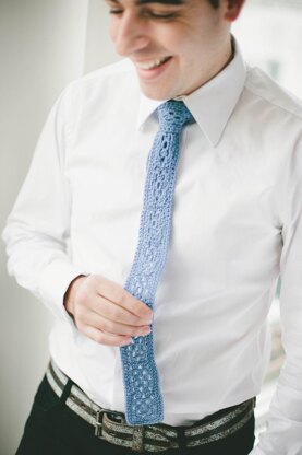 Inspired by catwalk trends, this tie uses tiny granny squares crocheted in a silky look yarn to give a fresh but retro 'mod' look.