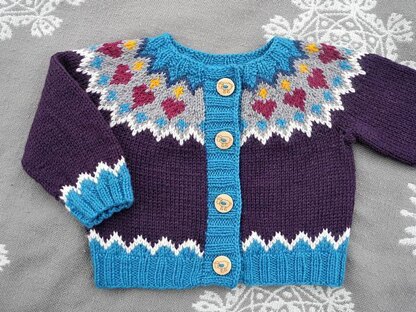 Stella is a baby cardigan with an Icelandic-inspired yoke with hearts. It's a fast and warm knit in a sport weight and fits size newborn – 3 months.