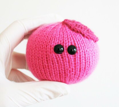 What you will need: 2 knitting needles (US2.5/3mm or as per tension advice), 5g dark pink yarn per cell (Sirdar Snuggly DK 484 ‘Cherry Pie’), 10g medium pink yarn per cell (Sirdar Snuggly DK 481 ‘Perky Pink’), Polyfil toy stuffing, 2 plastic toy safety eyes (9mm), 1 tapestry needle for finishing Skills used: Casting on and off, Increasing and Decreasing, Applique (sewing) Stitches used: Stocking stitch