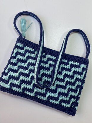 This bag is designed as a shoulder bag but you can make the handle longer and turn it into a cross body bag. It is worked in one piece from the top down and uses one of the mosaic crochet techniques. It has a zip closure and a lining can be added.