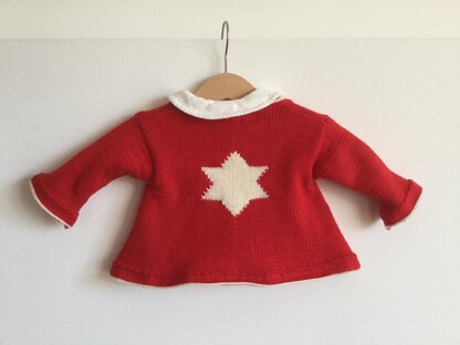Ich wollte zusätzlich zum Sternenjäckchen in blau noch eine Version für Mädchen entwerfen. Das rote Jäckchen hat eine kleine Borte an den Säumen und ist leicht a-förmig ausgestellt. This is the cardigan with a star in red. Look at the hem, very pretty for girls!!