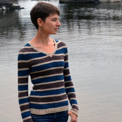 Stillness is a striped V-neck sweater worked seamlessly from the top-down, using the contiguous sleeve method developed by Susie Myers. Dress it up with a simple skirt, or wear it with your favourite pair of jeans on the beach.