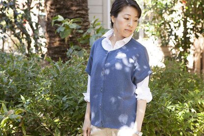 A short sleeved cardigan knit in Woolfolk Tynd. Buttons lined up in pairs are the eye-catching feature. Body and sleeves are knit in one piece, which makes it very simple to knit. It will be a great layering item for your spring wardrobe.