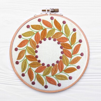 Beautiful, Colourful and Fun Hand Embroidery Designs Discover your next stitch journey.\n\nHere at Stitchdoodles we are all about creativity. Sitchdoodles was created in 2019 after I was finding it difficult to find hand embroidery patterns that were exciting and a bit different from the usual. Wanting to combine our love of hand embroidery stitches, traditional sampler techniques as well as quilt designs(!) I decided to come up with something myself and it has evolved into an array of wonderful and colourful designs that will hopefully inspire and excite people to pick up a needle and get 'happy stitching’.\n\nWhat you will receive:\n• This pattern is available as a PDF download so you can access the pattern as soon as you would like.\n• Each pattern comes with details on the colors, threads, and materials required.\n• Easy to follow instructions are given along with full-color photos.\n• All templates are provided actual size.\n\nA design inspired by my love of Baltimore quilts, this hand embroidery pattern showcases an array of beautiful autumn leaves and berries.\n\nThe Golden Leaves Hand Embroidery Pattern Design is approximately 6.5 inches and fits nicely in a 7 inch hoop. The Pattern details the floss and stitches I used in the example photo but feel free to make your own choices – it’s up to you!