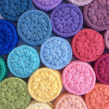 This make up scrubbies pattern includes instructions for two sizes, one approx. 6.5cm/2.5" for a small scrubbie and 9.5cm/3.5" for a larger scrubbie.