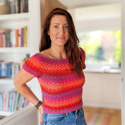 The Stories top is a subtly striped bandeau top that can be worn on or off the shoulders. With negative ease, it creates a tight fitting style that looks great worked with plain or variegated yarn or with a range of similar coloured yarns such as the Sirdar Stories Sunset bundle (shown in photos). It is worked from the top down in a seamless style, using granny stitch and double knit weight yarn.