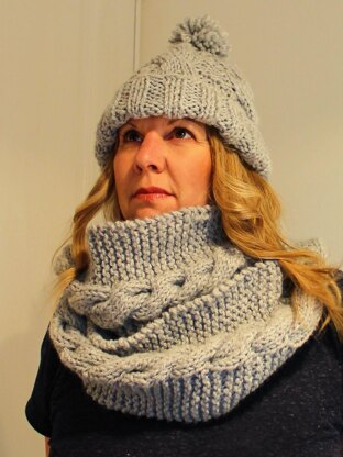 Hat size: The rib and cable mean that the hat is designed to fit a normal size adult (unisex) with a head circumference of between 57cm/22.5in upto 61cm/24in. The cowl size is its measurement before being joined together.