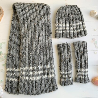 Matching hat, fingerless gloves, and scarf that knit up quickly with chunky/bulky yarn and are cosy and warm, keeping you snug in stormy weather!