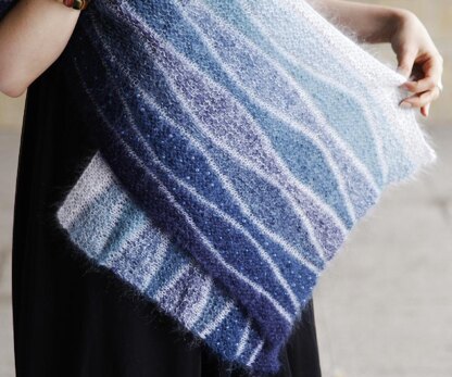 Stormy Seas is a stole or a long scarf. It is knitted sideways. Short rows are used to create the wavy shapes which are knitted in garter stitch with 2 strands of Rowan Kidsilk Haze held together. The four colourways are used in different combinations to derive additional shades of blue. The pale blue lines separating the waves are 2 rows of stocking stitch with a single strand of yarn. Beads are used on 2 of the waves placed in random fashion to evoke the sense of froth of stormy seas.