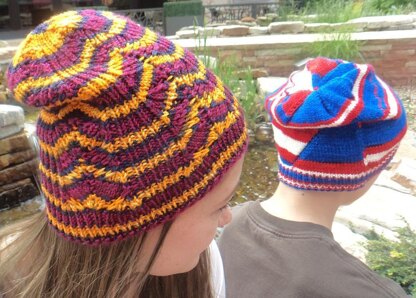 The other hats in this collection include TryAngles Hat and Folded Blanket Hat. Because of biasing from the stitch pattern, this pattern is less stretchy than the TryAngles Hat or the Folded Blanket Hat.