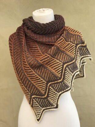Using two colours of fingering weight yarn worked in a repeating pattern of syncopated brioche stitches, this asymmetrical triangular shawl allows both main and contrast yarn to share the spotlight.