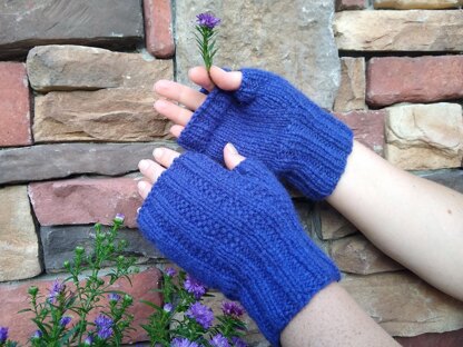 Fingerless mittens made with 2x2 ribbing for a cuff, top and thumb, stockinette stitch on a palm and broken rib on backside of a hand. Perfect one small skein project or to use leftover yarn.