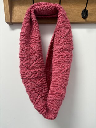 Two elegant lace stitch patterns are alternated around the circumference of this cowl design from Sandra Nesbitt, producing an intricately textured fabric.