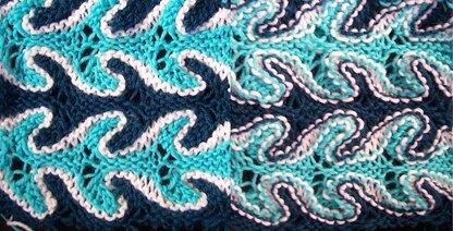THE PDF IS POSTED!!! With this pattern, you can knit a scarf, wrap, or shawl. The knitted fabric isn't bumpy, wavy, or curly; it lays perfectly flat. The unique wavy stripes do not require any stranding at all; you work with just one color in every row. The rippled fabric is created by decreases and increases only. I use the method developed Xandy Peters. Yarns and colors: I suggest using at least three different colors, but you can use as many color as you want, as long as you separate different stripes with the same contrasting color. Try to avoid splittiy yarns! One-ply, or tightly-spun multi-ply yarns are the best for this pattern. These color waves will also look beautiful if knitted vertically. You can try that if you don't mind casting on a large number of stitches ( I hate doing that - always get lost where I am). Although the pattern is written for flat knitting, it can easily be converted for knitting in the round (for socks or hats?).