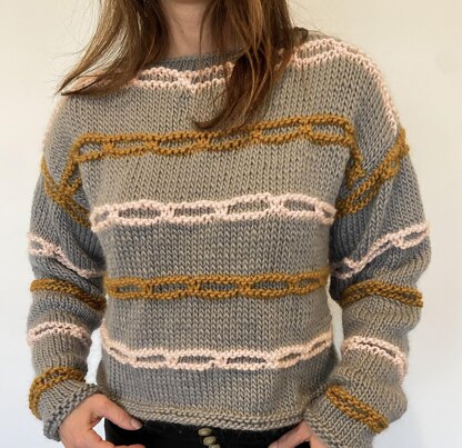Oh what fun! This Streamers Sweater is a super easy stitch pattern knit into a very basic shape sweater. You can cozy up in this piece that has endless possibilities! You can knit this sweater in 2 colors, 3 (as shown) or have each "streamer" knit in a different color.
