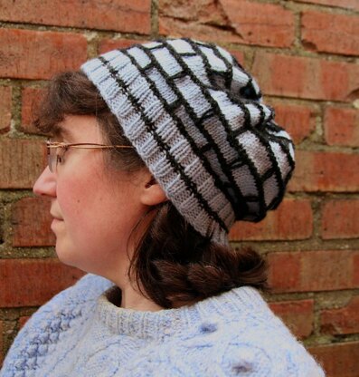 Bricklayers use different “bonds” or patterns of laying bricks side by side and end to end to build a strong wall. The simplest is the Stretcher bond; each brick is offset halfway from the brick below with each one showing its long side, or “stretcher”. The slipstitch pattern on this hat forms a design that resembles this stretcher bond. The hat has a wide ribbed brim to keep it in place and its slouchy shape is casual and easy to wear.