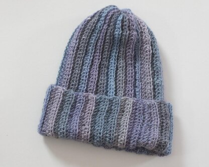 This ribbed hat is very soft and stretchy like a knit hat. It is worked across and seamed, a very easy pattern that can be made in any size. You can use any worsted weight yarn; I've chosen a subtle variegated yarn but a solid would be nice took especially for a man's cap.