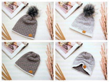 This beanie is an eye-catcher for sure. Our pattern gives detailed instructions for 6 sizes from XS (head size 20.3 in) to XXL (24.8 in). You will have much fun knitting this pattern and it goes very quick, too. You can knit it with 2 different colors and even 2 different stitches. One side is knitted with the stockinette stitch, but with a yarn with a gradient color run. The other side in knitted with the diamond pattern. You can choose each day, which style you prefer. As a result, you get 2 new beanies in 1!