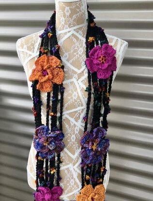- Chunky weight yarn is used for the main body of the scarf. Aran yarn is used for the flowers.