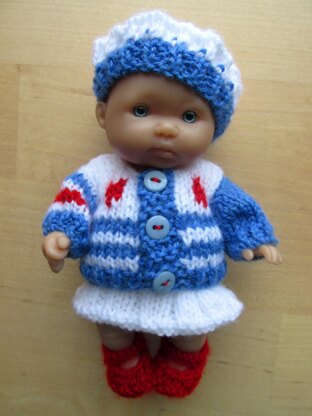 Easy to knit outfit with instructions for striped jacket with heart motifs on the front and back, pleated skirt, beret, panties and Mary Jane style shoes.