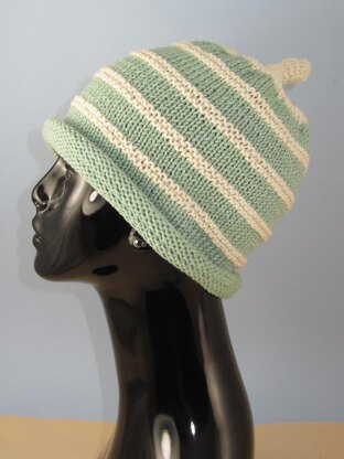 This is my Stripey Roll Brim Topknot Beanie Hat. This is a very simple hat to make yet the end result is quite stunning. This range of hats has been specially designed for summer wear so the yarns chosen are all cool to wear like cotton and bamboo. The knitting pattern provides full written instructions and there are step by step photos to help you with the simple makeup.