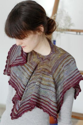 A snazzy striped shawl with lots of options for customization! Pick your size - a classic triangle, two triangles stuck together (slit square), or three triangles stuck together (mushy starfish), pick your sock yarns (just about anything’ll do!), pick your edging, and put the stripes wherever you want ‘em! (I’ll tell you where I did them, of course, but improvisation is easy and welcome.) The somewhat crafty striping method allows you to do stripes with odd numbers of rows, for a delightfully gradient look. You could even get crazy and use more than three colors.