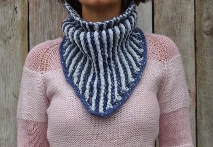 This stylish unisex bandana cowl is knitted flat, sideways in a combination of two yarns that creates a faux brioche look.