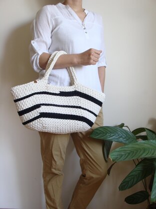 Small size oval basket bag crochet pattern with irregular stripes which makes crochet interesting and far from boring. Versatile, this purse can be used as a handbag, shoulder bag, beach bag, or as a storage basket at home. Fill it with everything you need to carry with you every day, books, beach stuff, knitting and crochet projects, or yarn stash. Perfect as a gift too.