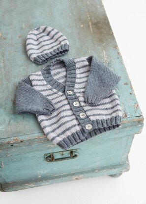 Simple striped baby cardigan written for both boys and girls fastenings. Uses 2 [2:2:3:3] balls of 1 colour and 1 [1:1:1:2] balls of second.