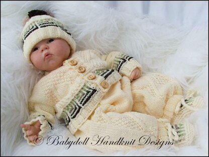 Knitting pattern for a cosy suit consisting of jacket, trousers, hat and bootees. Features a reall attractive and unusual striped squares pattern.