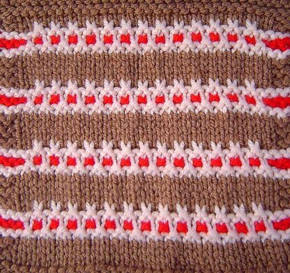 Three colors combine to make horizontal stripes with little dots. This square is easy to work as you only knit with one color at a time and use slipped stitches to create the pattern. 7 x 7â Square #14 of 20 for an afghan, laprobe, or as a single for a dishcloth