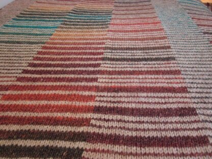 The blanket is composed of long strips knitted individually and sewn together. Magically, the stripes in the strips match horizontally, while letting the colours flow at different pace along each (and within some) of the strips.