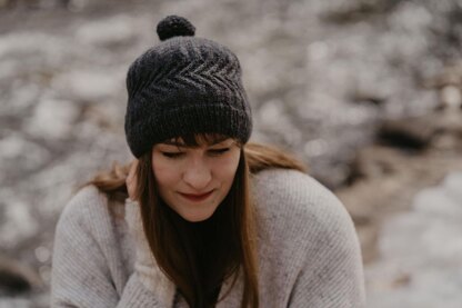 Inspired by early springtime's frigid streams, Strøm is worked in the round from the bottom up, with fun, simple cables along the way, then finished with an adorable pompom!