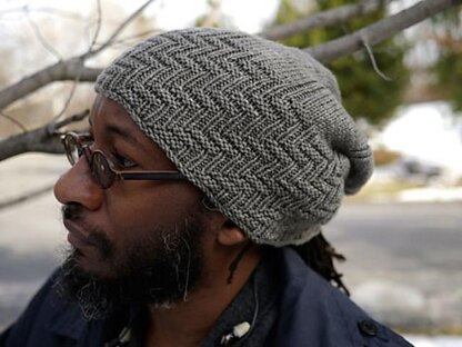 This slouchy stocking cap in multiple sizes knits up quickly in DK/light worsted yarn for a stylishly warm answer to mid-winter cold. The hat brim is worked in reversible herringbone rib and can be doubled back if desired; the pattern continues with a simple linear detail through the body. For maximum slouch, choose a very softly spun yarn and/or one that blends silky, relaxed fibers with wool. For snug fit, go down one size. Substituting yarn and/or needles may result in an overall variation in size.