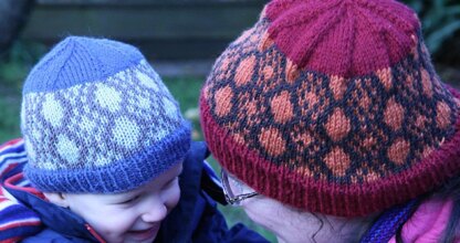 Struan and his brother Andrew are fraternal twins, similar but not identical, so they needed hats on the same theme. The patterning on the two hats is the same, but one is created using a textured stitch pattern and the other using stranded colourwork. The companion pattern to this one is Andrew's Brother's Hat. In five sizes from Baby (14" hat circumference) up to Large Adult (22" hat circumference), Struan's Brother's Hat has a stranded colourwork pattern worked in stocking stitch in the round. A maximum of two colours are used per round. Pattern tension is 22 sts + 28 rows over 4 inches (10cm) using DK yarn and 4mm (US 6) needles measured over stranded colourwork. All sizes refer to the circumference of the unstretched hat. Allow around 2" (5cm) negative ease for each size.