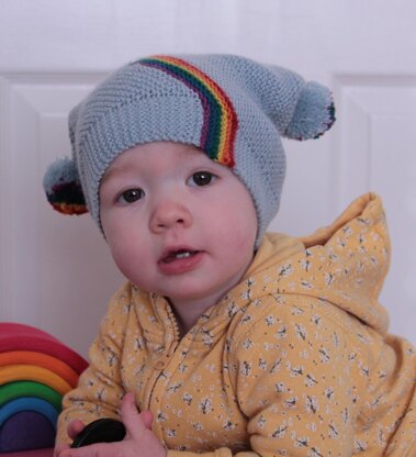 Stua (Irish for Arc) is a biased garter stitch hat with a square top. The hat features diagonal rainbow stripes, and is completed with rainbow pom poms. Stua is knitted flat, grafted into a tube and closed with a seam along the top.