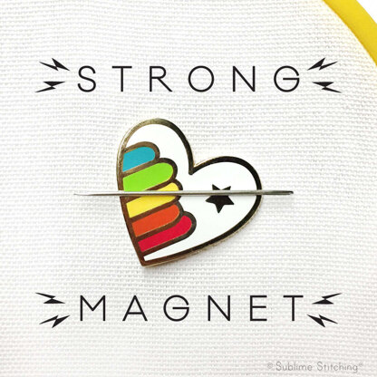 Hoop Flair needle minders are shiny, hard enamel with a strong backing magnet. Put the magnet at the back side of your fabric, and the decorative side to the front. Your needle will stick to its face when you need to temporarily set your needle down! Incredibly helpful as you work, and pretty to enjoy.