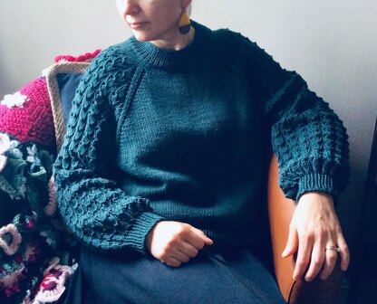 The Succulent stitch pattern is a combination of ribbing and lace, creating a very stretchy fabric, ideal for the balloon sleeves. It has just enough texture and interest for a pullover that is otherwise very simple, and can be an everyday staple.