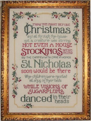 The elegance of Christmas holly and gold gracefully encircles the opening lines of the beloved poem "'Twas the Night Before Christmas." Handsome colors make this design a striking addition to your holiday home celebrations. Our model was stitched using Sullivans 100% Egyptian Cotton embroidery floss "over two" on 30 count #1101 "Light Khaki" linen from Weeks Dye Works.