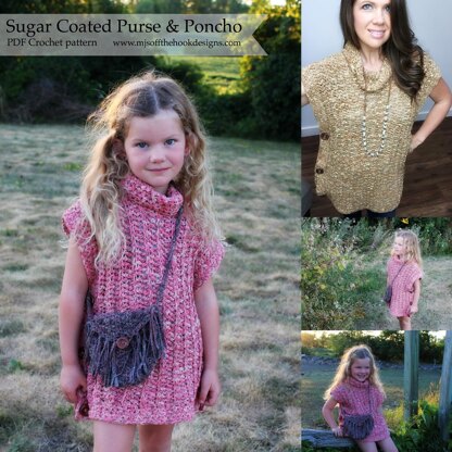 This is a PDF crochet pattern for a yummy Sugar Coated Poncho. This Poncho has a stretchy ribbed design with a cowl neck and 3 buttons fastening the garment on each side. I've also included a sweet little BONUS fringe purse with this pattern!!