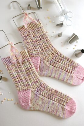 A simple and easy to remember lace repeat that mimics lines of beautiful piped icing for a decorative touch to these socks which are worked from the cuff down.