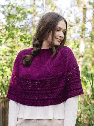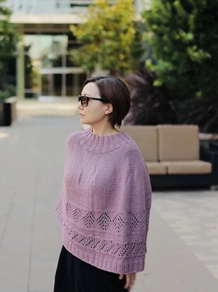 The Poncho is worked in the round from the top down. Increases are worked evenly in the upper body to accommodate the lace pattern, then two lace patterns are worked to the hem.