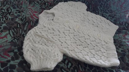 Beautiful short sleeve, round neck lace cardigan, knitted in dk yarn. The 6 row repeat pattern is easy to master and produces a lovely lace effect. Single rib welts, cuffs and neckline add to the simplicity of the design.