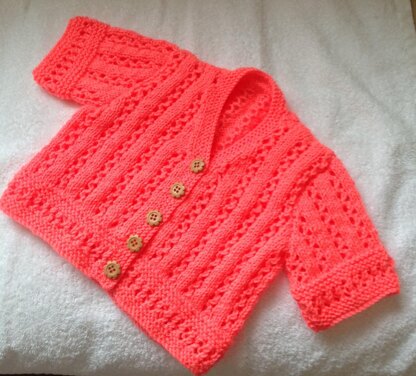 This beautiful short sleeve cardigan is ideal to pop over a pretty summer dress, when it cools down in the evening. It is a written pattern worked in one piece to the armhole saving on sewing seams. The pattern looks harder to do than it is, but the effect is pretty.